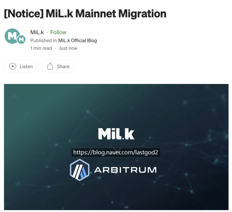 밀크 코인 아비트럼 마이그레이션 MLK 네트워크 이전