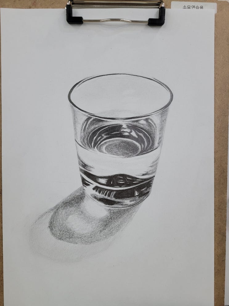 다음날 와서 마저 진행한 유리컵 이제는 곧잘 선생님의 피드백 없이도 거침없이 그려갔다. 유리잔을 그릴 ...
