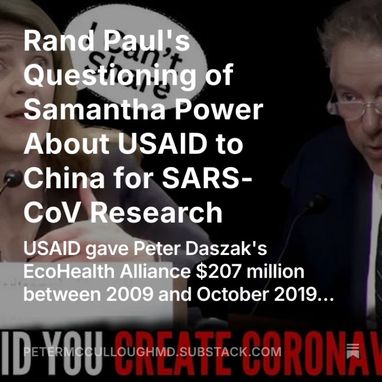 랜드 폴 상원의원이 사만다 파워에게 SARS-CoV 연구를 위해 중국에 지원한 USAID에 대해 질문한...