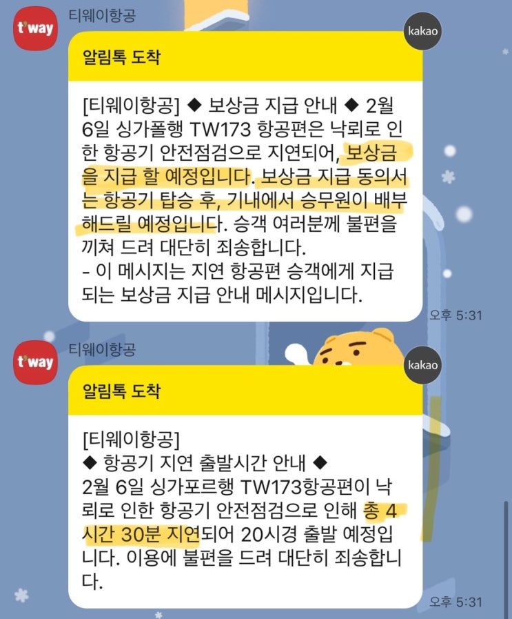 티웨이항공 지연 보상 후기 (싱가포르행 / 4시간 이상 지연)