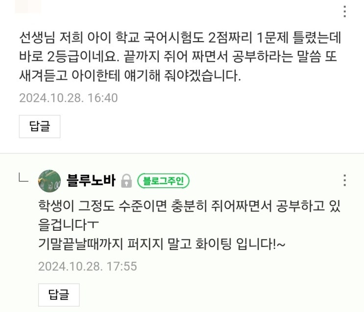 선생님 저희 아이 학교 국어시험도 2점짜리 1문제 틀렸는데 바로 2등급이네요. 끝까지 쥐어 짜면서 공부하...