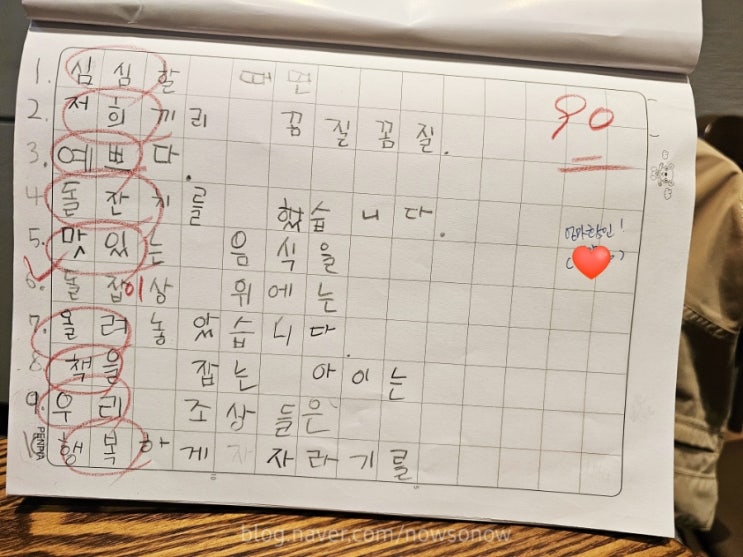 초등학교 입학 후 본 첫 받아쓰기 시험. 요즘은 다 미리 문제를 알려줘서 연습만 해서 보면 된다. 다른 학...