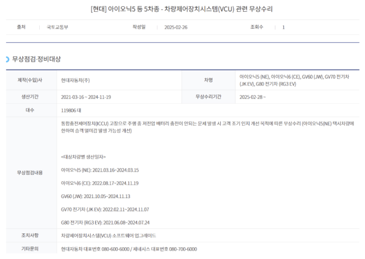 현대 아이오닉5 외 전기차 ICCU 및 VCU 무상수리 업데이트