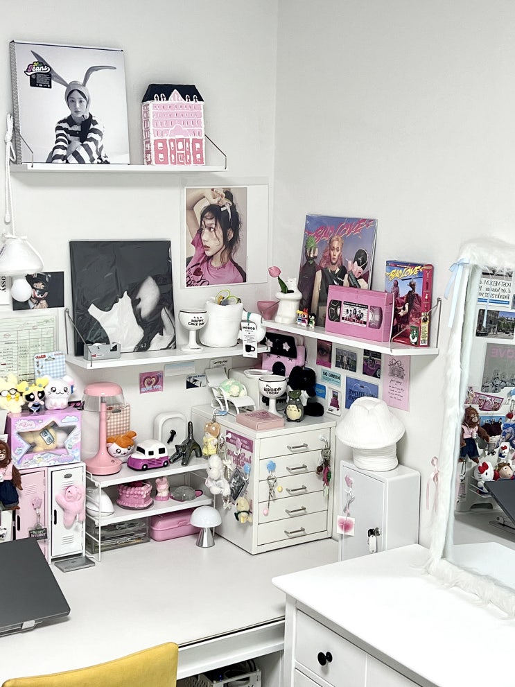 핑크색이 돋보이는 소품 덕후 데스크테리어