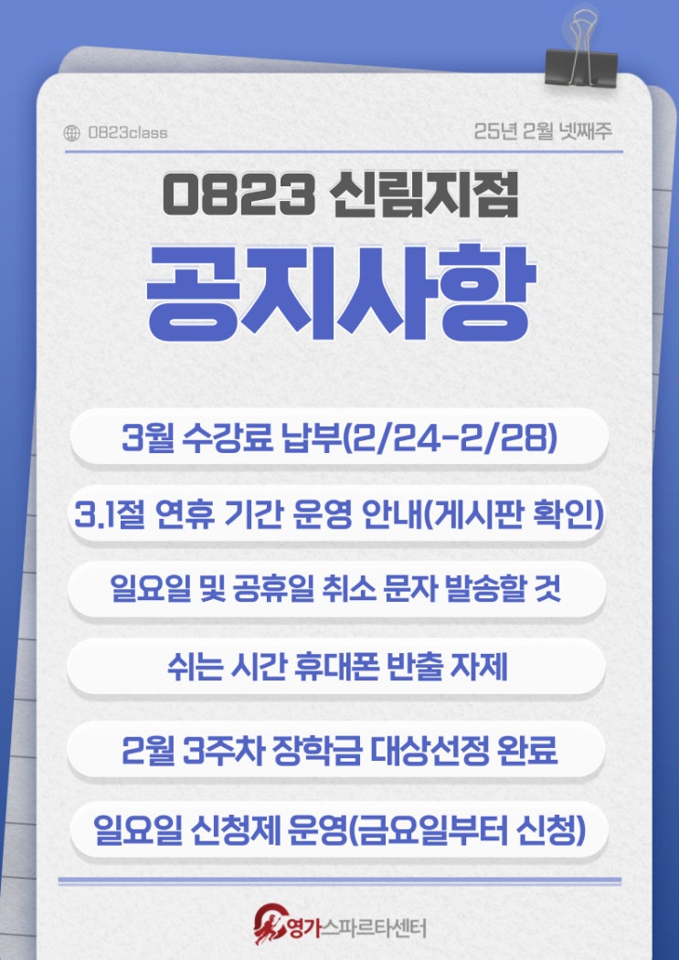 0823 신림 관리형 독서실 2월 4주차 공지사항