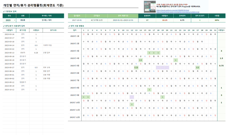 개인별 연차관리 관리(회계관리 기준) 구글 스프레드시트 안내 및 활용방법