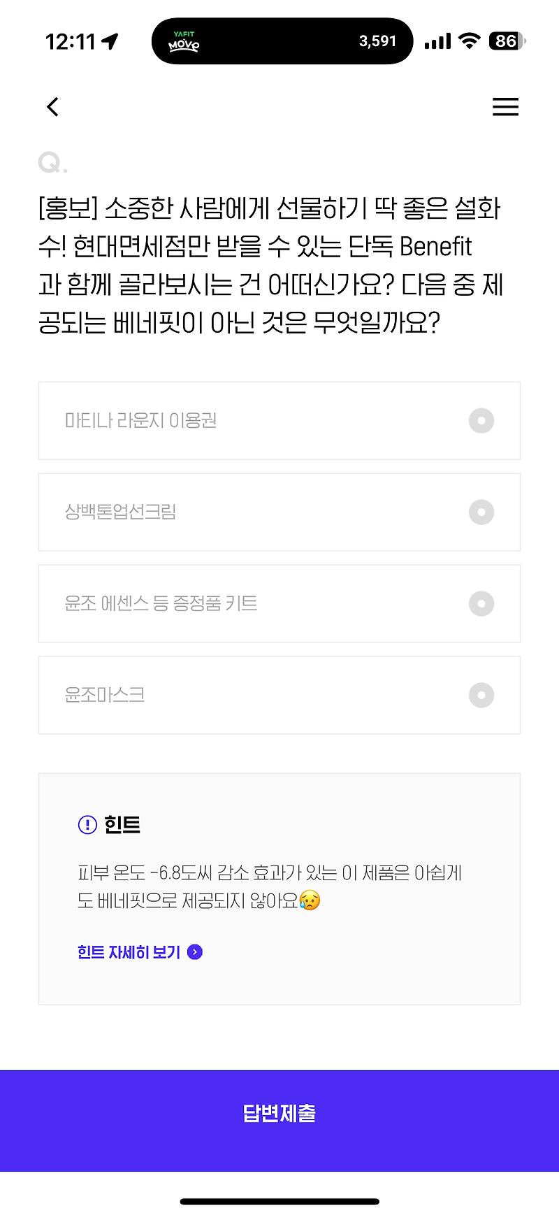H포인트 퀴즈 2월 8일 문제입니다 소중한 사람에게 선물하기 딱 좋은 설화수! 현대면세점만 받을 수 있는 단독 Benefit과 함께 골라보시는 건 어떠신가요? 다음 중 제공되는 베네핏이 아닌 것은