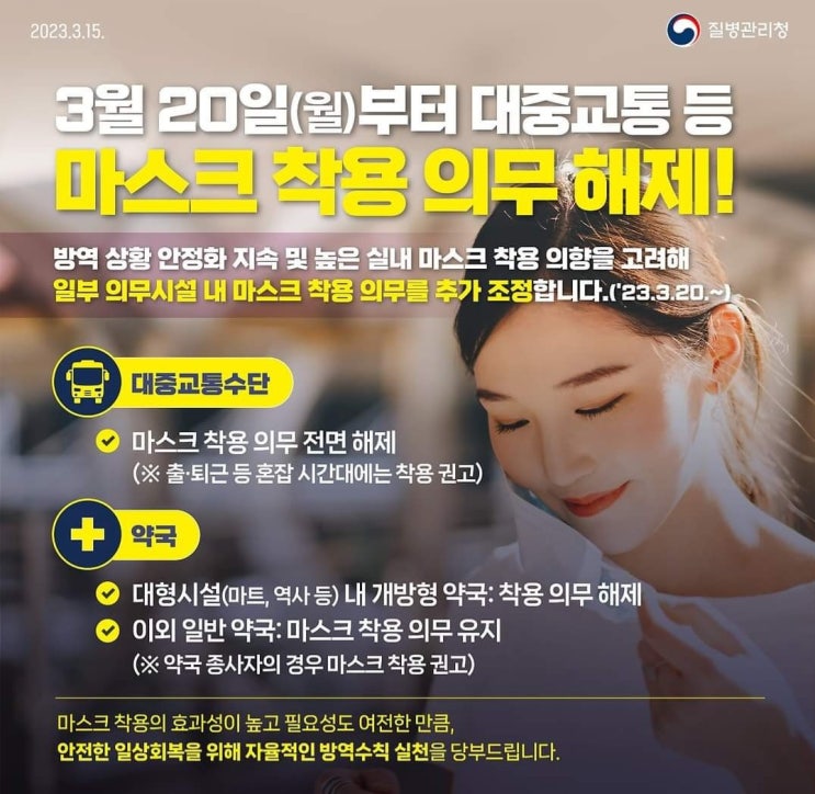 2023년 3월 20일... 오늘부터 대중교통 이용시에도 마스 크 착용 의무가 해제되었습니다. 20년 10월부터 마...