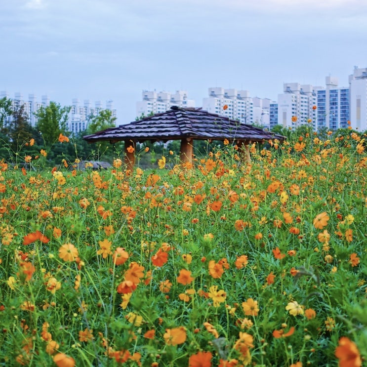 계양꽃마루의 황화코스모스, 두번째 이야기. 인천 계양구 서운체육공원, 계양경기장 일대의 오렌지색 가을 코스모스 꽃밭. 코로나19 바이러스 야외데이트, 당일치기여행, 애견산책 핫플