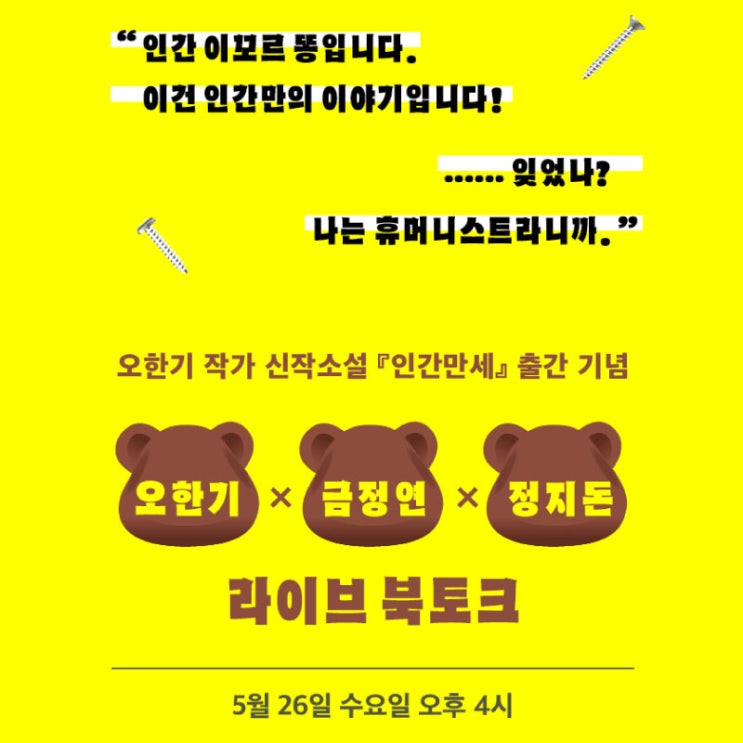 [알라디너TV X 작가정신] 『인간만세』 라이브 북토크 진행! [오한기 X 금정연 X 정지돈] 질문 남기시고 4종 굿즈 세트 받아가세요
