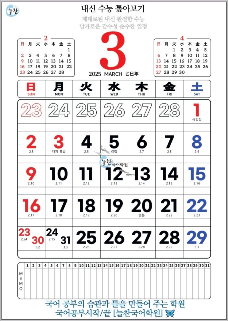 [제대로된 내신, 완전한 수능 ? 늘찬국어학원] 2026학년도 대입 수시 달력(PDF파일)?