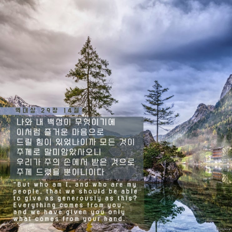 역대상 29장 14절 나와 내 백성이 무엇이기에 이처럼 즐거운 마음으로 드릴 힘이 있었나이까 모든 것이 주...