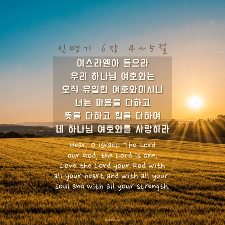 신명기 6장 4~5절 [개역개정, NIV] 이스라엘아 들으라 우리 하나님 여호와는 오직 유일한 여호와이시니 ...