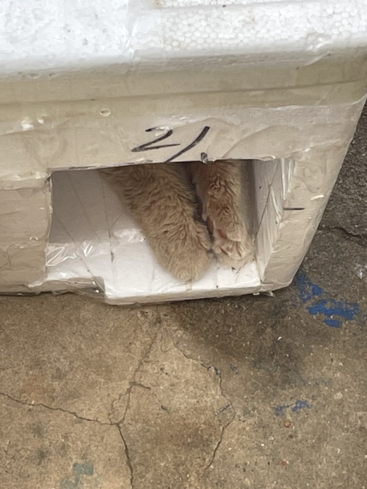 아침에 비 오고 추우니까 아빠가 만든 아이스박스집에서 쭈굴스럽게 쉬고 있던 고양이.. 친구가 사준 랭커 ...