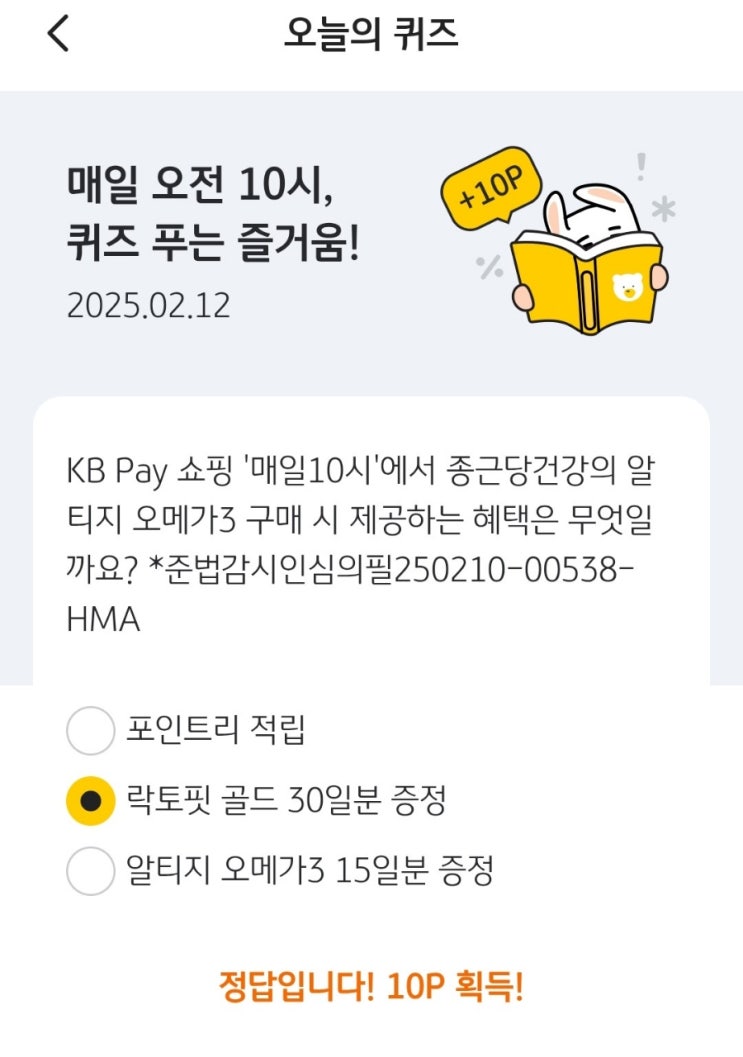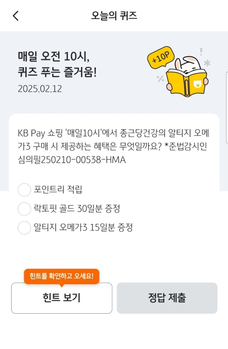 KBPay퀴즈 2025년 2월 12일 수요일 KB페이퀴즈 KB Pay 쇼핑 '매일10시'에서 종근당건강의 알티지 오메가3 구매 시 제공하는 혜택은 무엇일까요?