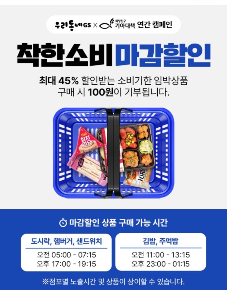 착한 소비 마감 할인 최대 45% 할인받는 소비기한 임박상품 구매 시 100원이 기부됩니다. 마감할인 상품 구...