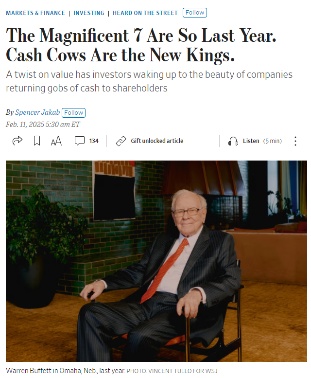 매그니피센트 7은 지난 시대의 이야기, 이제는 캐시 카우가 왕좌를 차지한다 - 가치투자의 새로운 해석(WSJ)