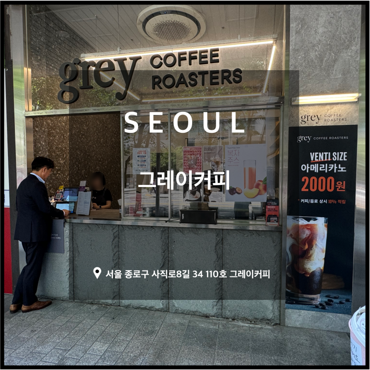 외관 매장정보/위치 * 방문시점 : 2024. 09 * 상호명 : 그레이커피 * 위치 : 서울 종로구 사직로8길 34 110...