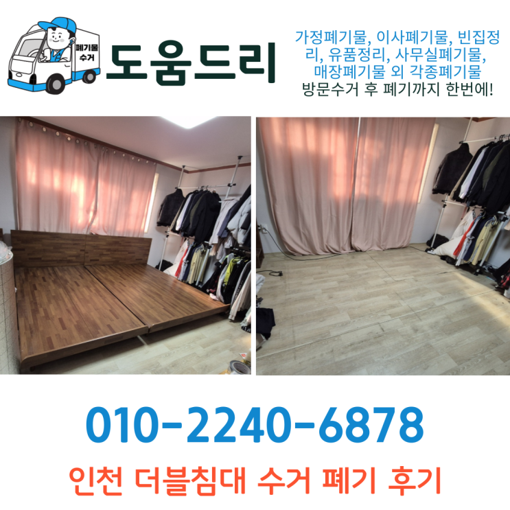 안녕하세요, 도움드리입니다. 오늘은 인천에서 침대 수거 작업을 진행했습니다. 고객님은 트윈 침대 두 개...