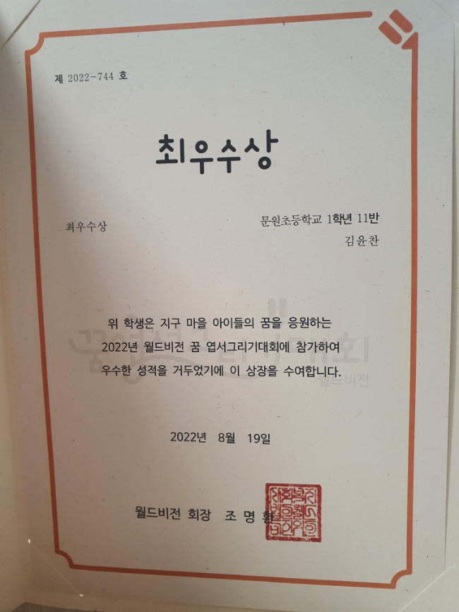 찬솔일기 ~D+2680,D+1911, 월드비전 꿈엽서그리기 최우수상