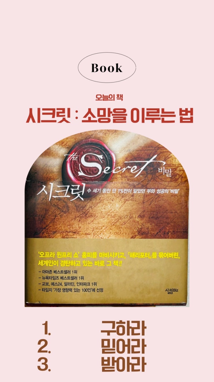 ‘시크릿’ 책 감명 깊은 부분 공유 최근에 읽은 ‘시크릿’이라는 책은 소망을 이루는 세 가지 방법을 제...