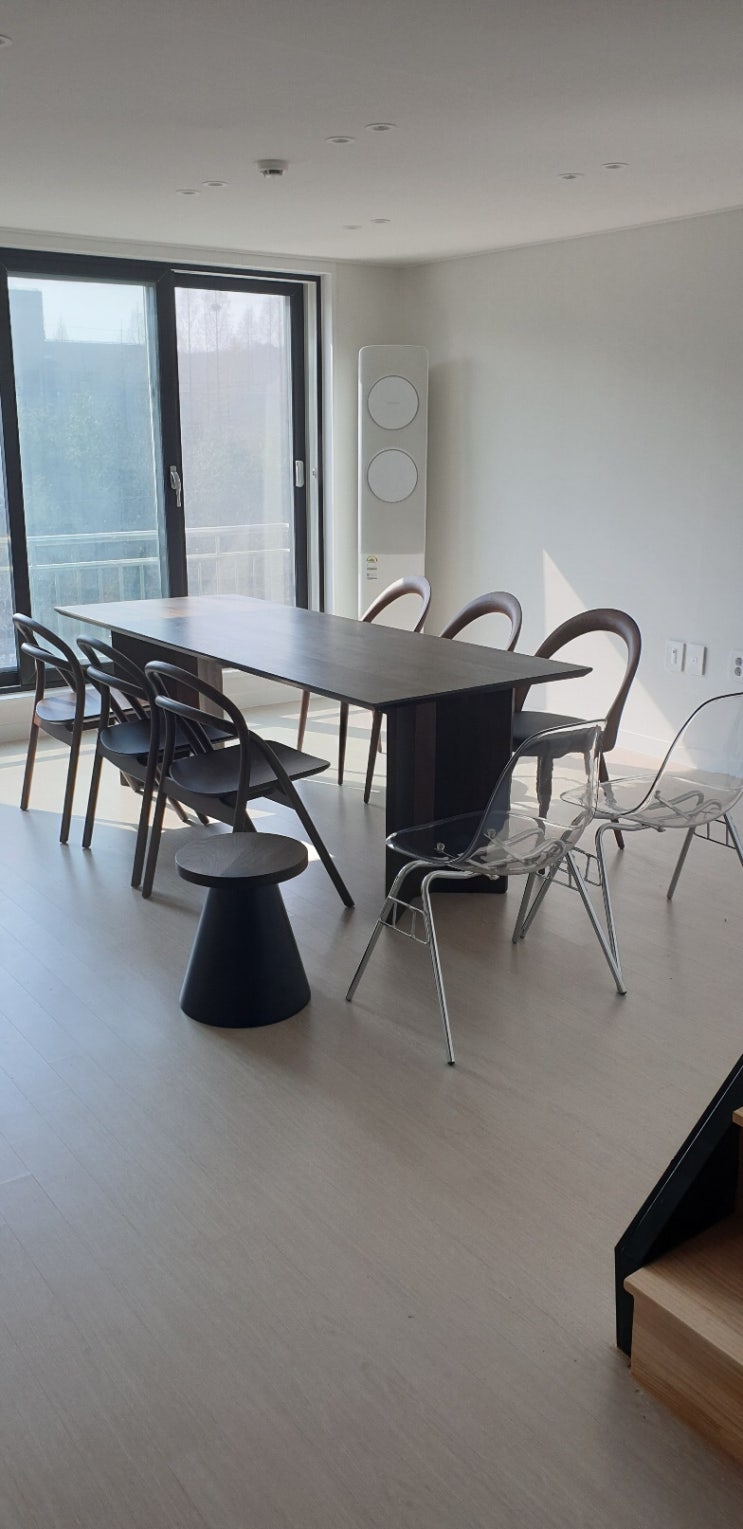 거실인테리어에 큰 블랙 월넛 테이블이 분위기를 압도합니다 3BL 특수다리의 감각과 디자인체어의 선택이...