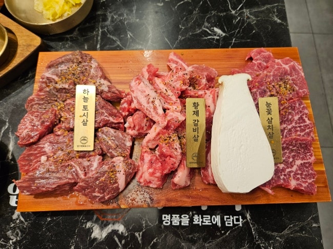 삼산동에 고기 먹으러 왔어요. 국내산 흑돼지 뉴코아 아울렛 대로변 길 건너편 목화예식장 골목으로 조금만...