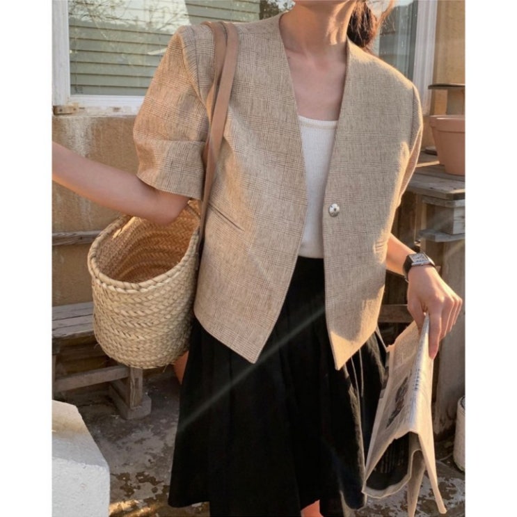 여름 오피스룩, 하객룩 브이넥 노카라 반팔 체크 린넨 자켓 코디