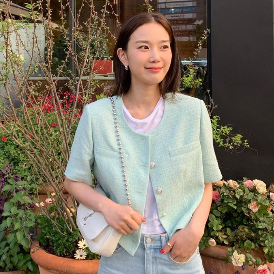 장희령 배우님의 민트 민트한 화사한 봄 여름 트위드 반팔 자켓을 보면 봄이나 여름에도 충분히 자켓을 입...