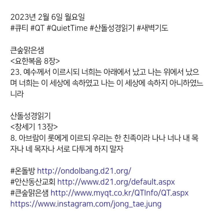 2023년 2월 6일 월요일 #큐티 #QT #QuietTime #산돌성경읽기 #새벽기도 큰숲맑은샘 <요한복음 8...