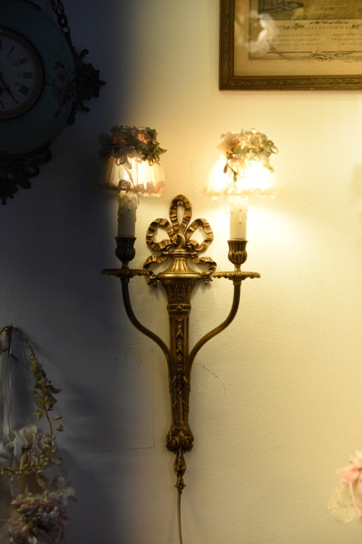빈티지 프랑스 도자기 꽃 2구 벽등 Size 길이 약 47Cm 정말로 멋지고 예쁜 벽등입니다 갓까지 넘 잘어울...