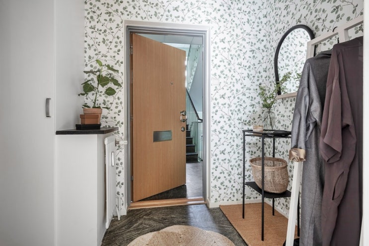 다양한 철제가구사용 철제테이블 철제선반 현관 포인트벽지 돋보이는집
