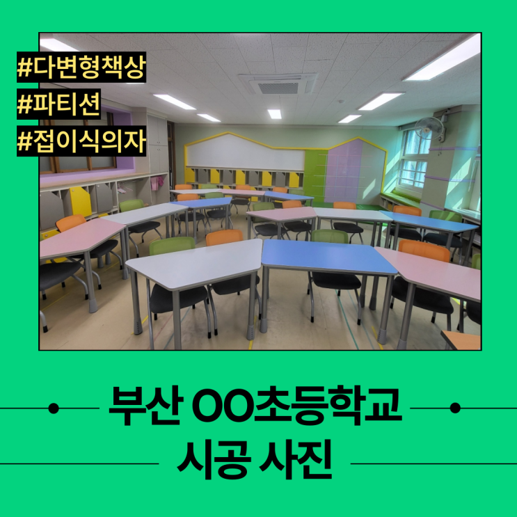 [월드퍼니처]부산 OO초등학교에 설치가 완료된 다변형책상, 파티션,접이식의자 시공사진을 소개해 드립니다