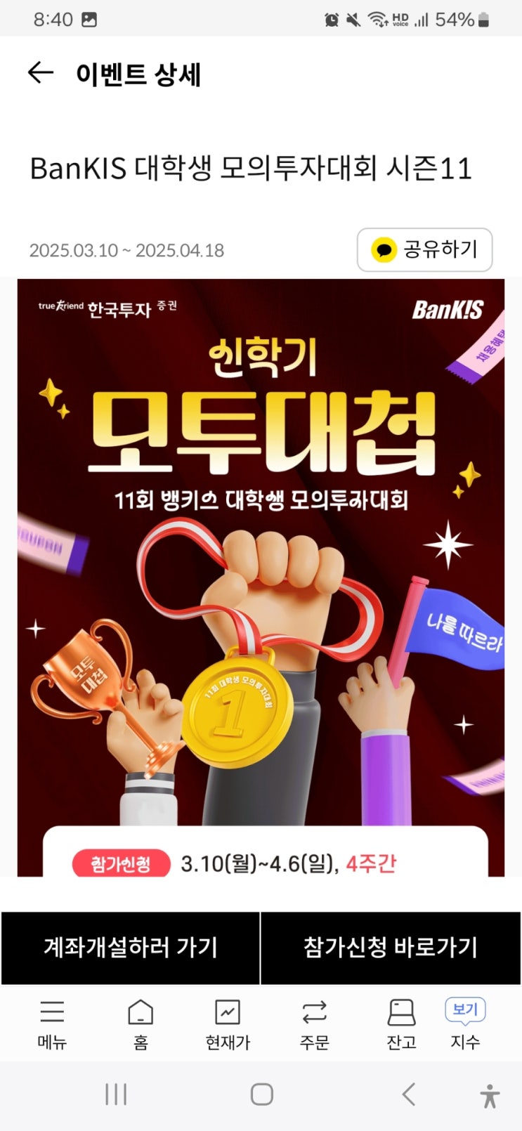 한국투자증권 대학생 모의투자대회 신청하고 1주 이상만 매매하면 컴포즈 커피1잔을 지급한다. 뱅키스계좌...