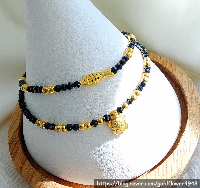 블랙 스피넬과 순금의 조합 여성스러운 느낌의 1돈 물고기, 거북이 팔찌