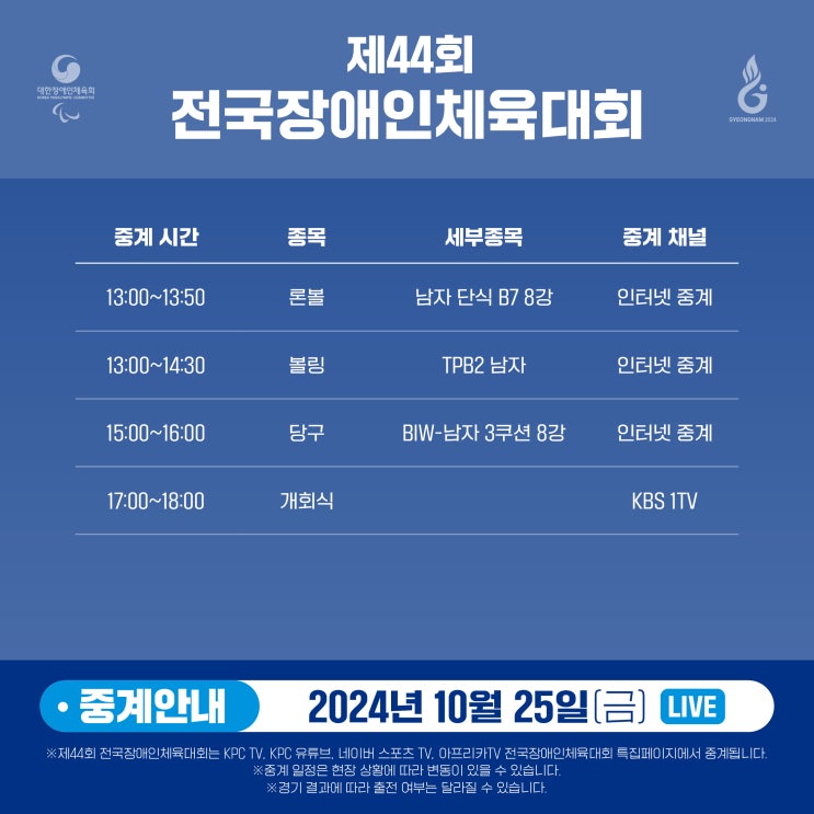 오늘 개막한 제44회 전국장애인체육대회, 신나게 즐기고 계신가요? 내일 10월 26일(토) 경기 일정 안내입니...
