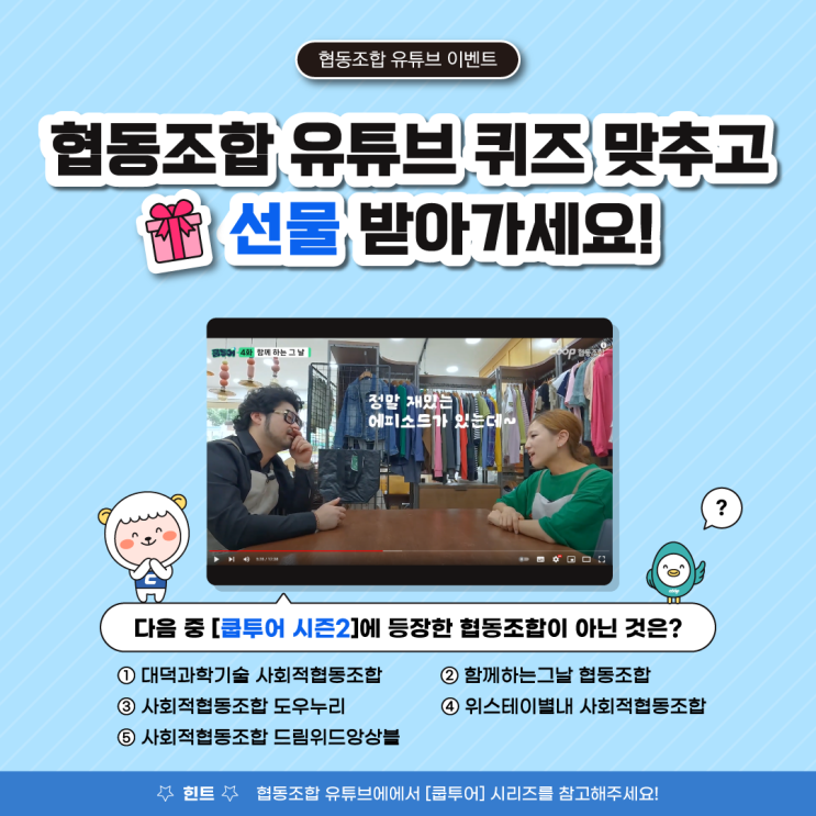 ?이벤트? 협동조합 유튜브 퀴즈 맞추고 선물 받아가세요!