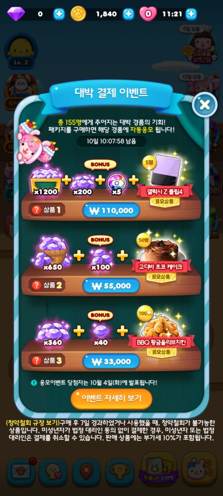 [모바일게임] "애니팡3" 플레이하고, (갤럭시z플립4/케이크/치킨..) 응모하세요~