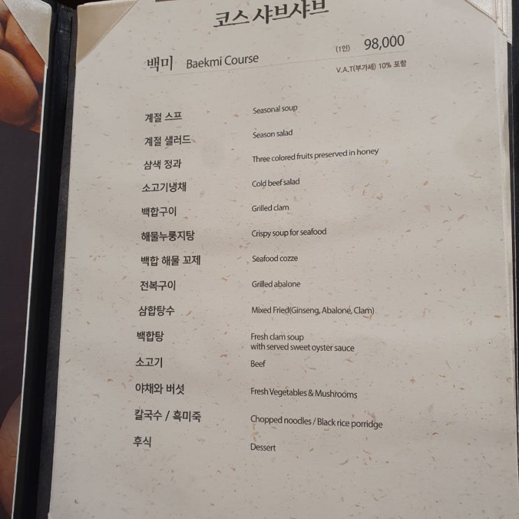 기록용 메뉴판 사진 백합구이 들어가있는 미려 58,000원짜리 먹음 음식나온 순서대로 전채요리들. 까먹고 ...