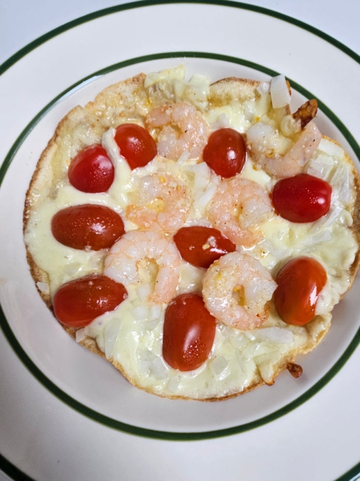 또띠아피자 재료 : 또띠아 4, 냉동새우 20~25, 다진마늘 2, 버터, 페퍼론치노, 방울토마토 12~15, 양파 2 ...