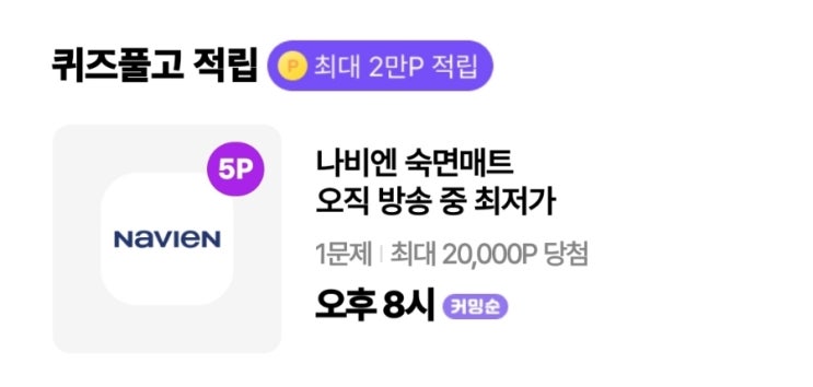■ 참여방법 : OK Cashbag 앱 > 퀴즈풀고 적립 ◇ 20시 ● 나비엔 Q. 대한민국의 숙면을 책임지는 ...