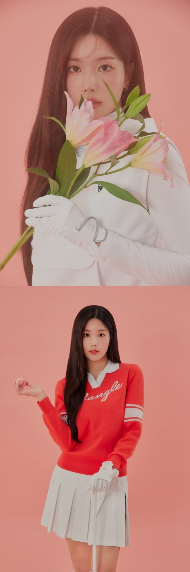 여성골프웨어 브랜드 권은비 봄골프웨어는 와이드앵글 골프니트 티셔츠 스커트