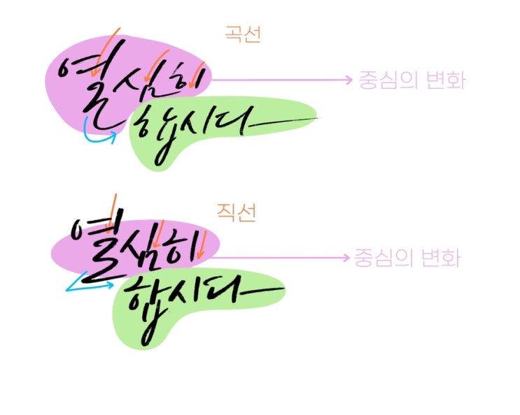 눈여거 볼 포인트가 몇가지 있습니다. 곡선이냐 직선이냐 줄과 줄사이의 중심이 어디에 있냐 글자의 폭에 ...