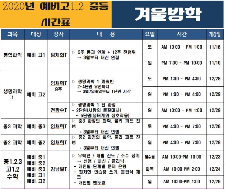 [대치동학원]원인과 결과 학원 - 2020년 겨울방학 시간표
