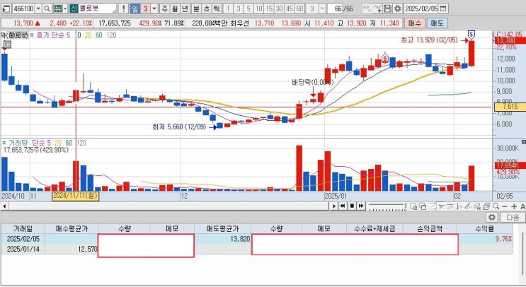 클롯봇 매매이유 견고한 박스권 안에서 주가 움직임 신고가(공모가) 돌파 예상. 보유기간은 3주 +9.76% 수...