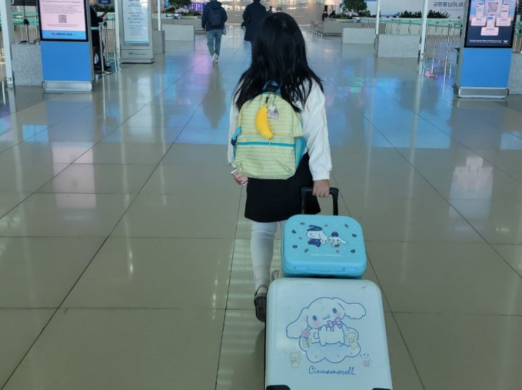 혼자서 가방 3개를 책임지는 귀여운 우리 딸 사진으로 시작 :) 하늘색 캐리어랑 잘 어울리는 대한항공 탑승...