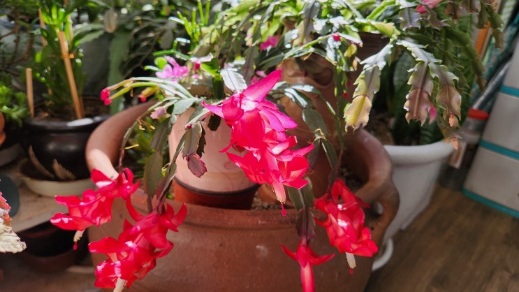 초겨울 추위에 춥지도 않은지 하얀 꽃의 게발선인장이 한가득 피더니 이번에는 붉은빛의 게발선인장이 사무...
