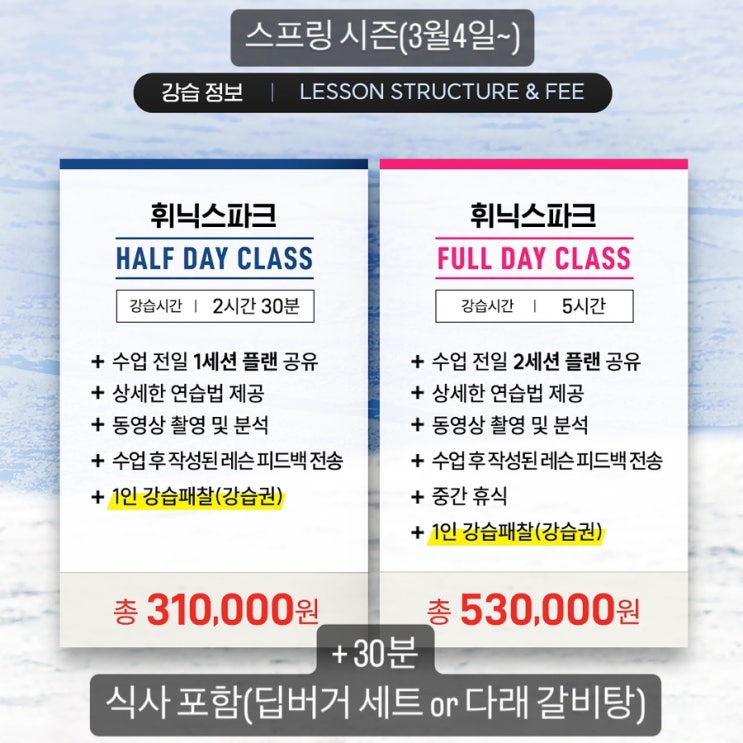 휘닉스파크 스프링 시즌(3월4일~)이 다가옵니다. 이를 맞이하여 세션당 시간 30분 추가, 식사 포함(딥버거 ...