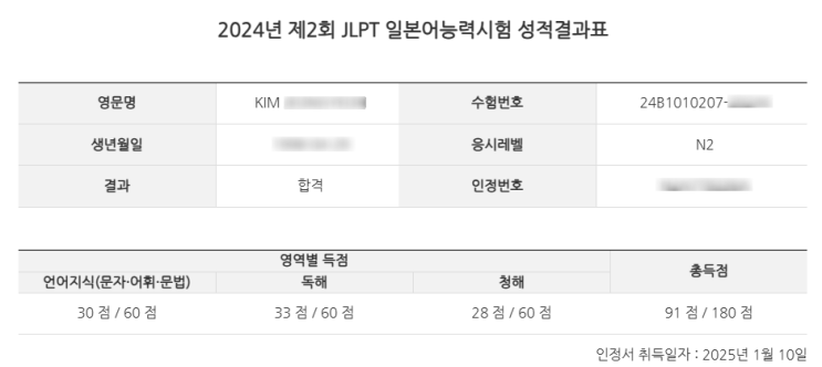 JLPT N2 시험 성적조회 기간 2025년 1월 31일(금) 10시 00분 ~ 3월 7일(금) 24시 00분 성적증명서 등 ...