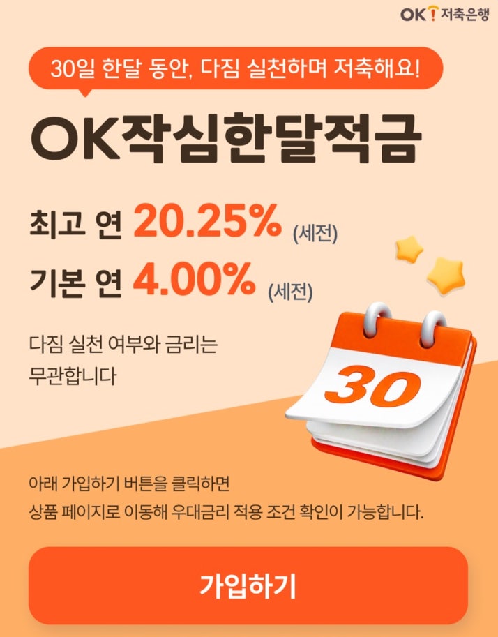 OK저축은행 OK작심한달적금 이자 최대 연 20.25%